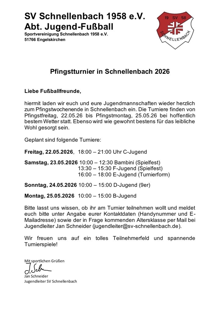 Veröffentlicht am März 6, 2026März 6, 2026 von Sophia KilianPfingstturnier 2026 in Schnellenbach Ihr wollt an unserem diesjährigen Pfingstturnier teilnehmen? Dann meldet euch gerne bei unserem Jugendleiter Jan Schneider. Wir freuen uns auf euch!